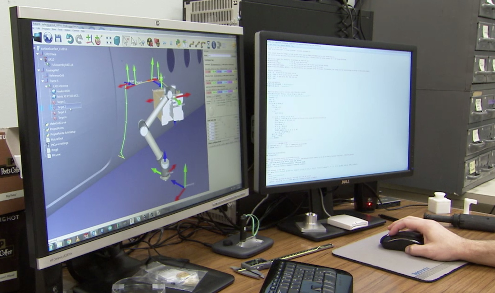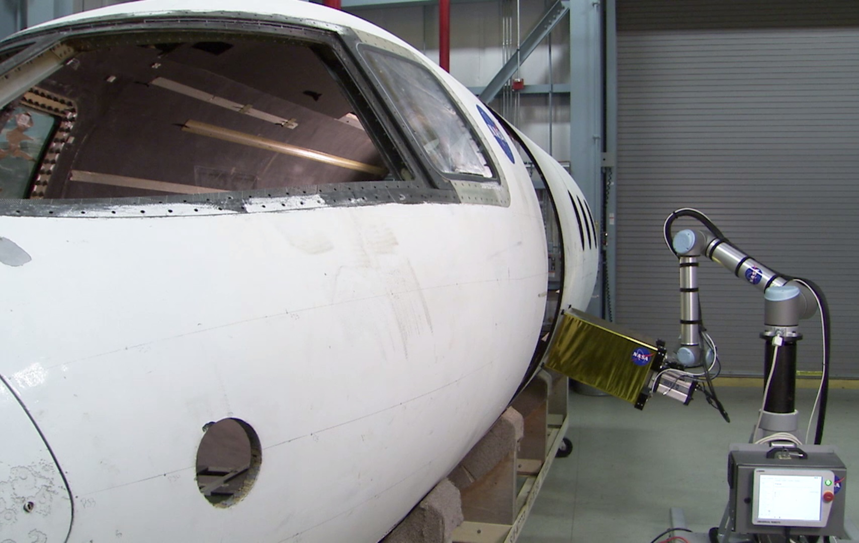 为了完成这项任务,美国宇航局建立了一个用于复合飞机机身的自动化检查系统。自动化系统会加快检查时间并降低成本。UR10协作机器人只能使用一个操作员进行检查。机器人将检查头移至先前编程的位置。Robodk软件用于模拟和编程检查模式,以确保机器人不会错过任何区域。