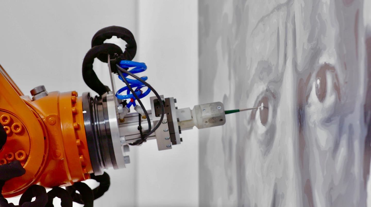 由数字艺术先驱罗布·卡特(Rob Carter)和尼克·卡特(Nick Carter)构思的巧妙的“黑暗工厂肖像”(Dark Factory Portraits)展览展出了库卡(KUKA)的一个工业机器人手臂,艺术家们称之为“海蒂”(Heidi),它可以用丙烯酸树脂为著名艺术家制作精美的艺术肖像。
