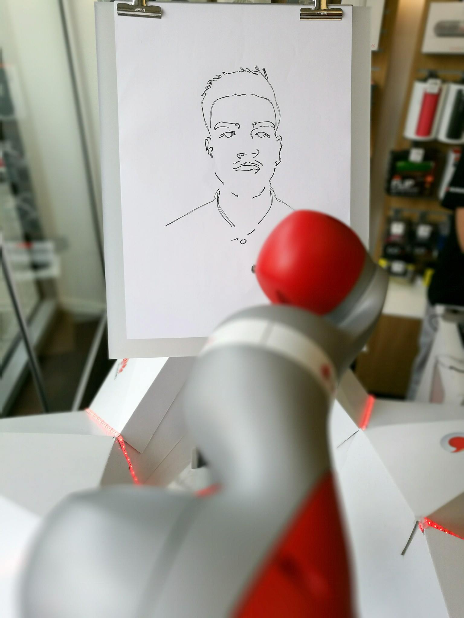 First, a picture of the customer was taken with aHuaweiP9 Leica Dual camera and converted into an svg image. From there, CMOCOS used RoboDK’s simulation software to automate the portrait printing from the svg image. RoboDK was used to create and simulate the robot path using offline programming tools and send it to the robot automatically. With those few simple tools, customer after customer had their portrait magically appear by this artistic robot.